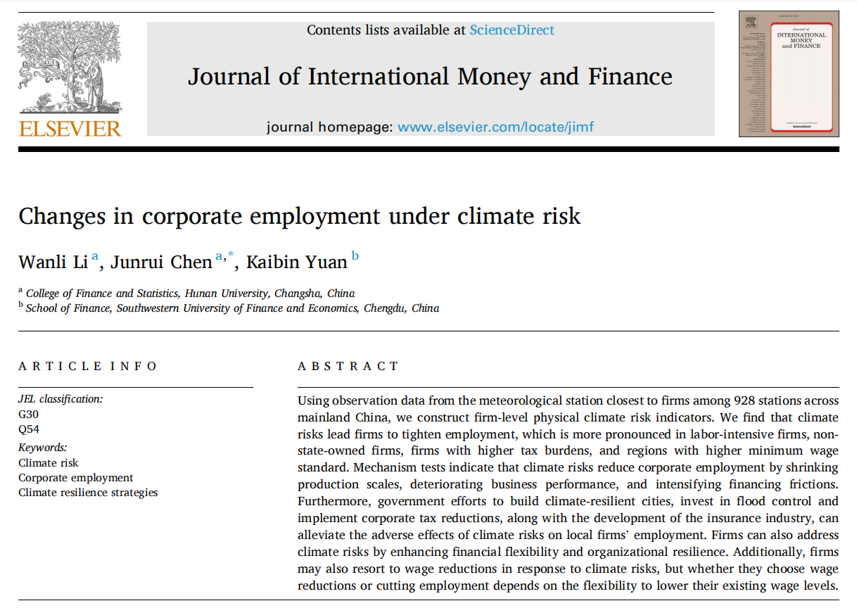 近日,A动漫 应用金融系李万利副教授与2023级博士生陈君睿合作的论文“Changes in corporate employment under climate risk”在国际金融学领域权威期刊Journal of International Money and Finance发表。