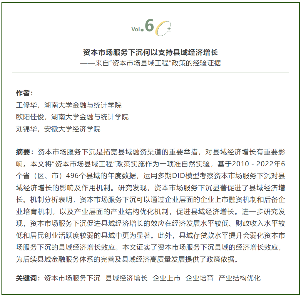 近日,A动漫 应用金融系王修华教授,和2022级博士研究生欧阳佳俊、安徽大学经济学院刘锦华老师(原A动漫 2020级博士研究生)合作的题为“资本市场服务下沉何以支持县域经济增长——来自“资本市场县域工程”政策的经验证据”的论文发表在《中国农村经济》2025年第6期。