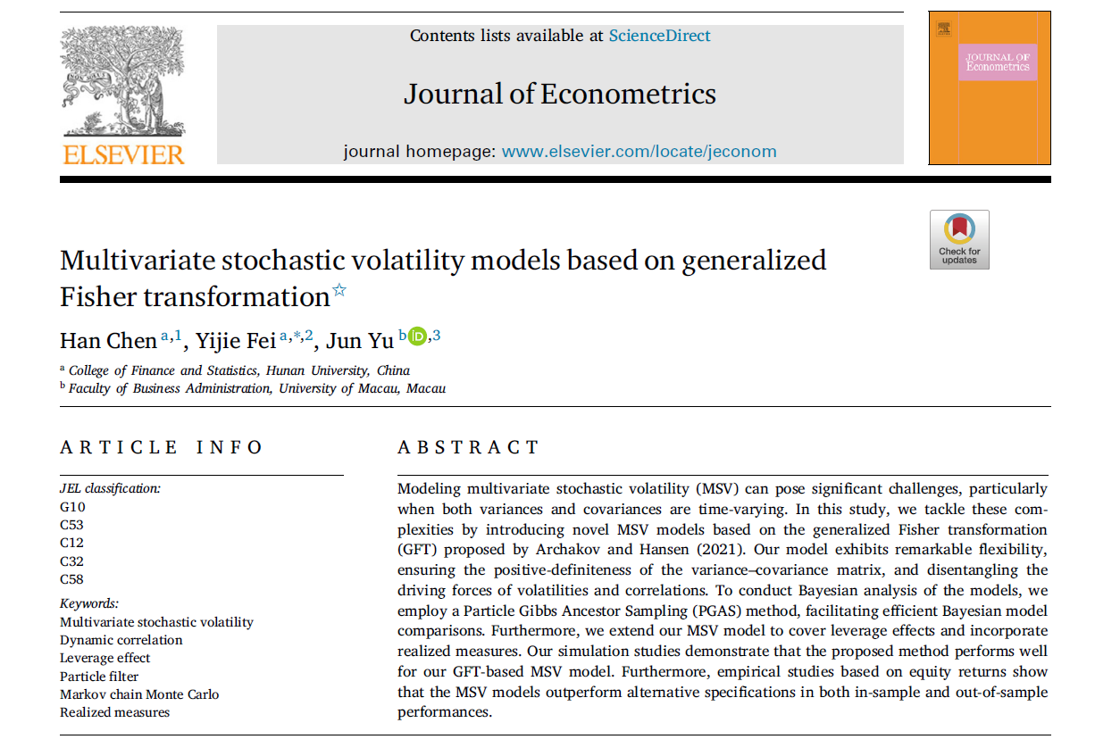 近日,A动漫 陈汉助理教授、费毅捷助理教授与澳门大学余俊教授合作完成的学术论文“Multivariate stochastic volatility models based on generalized Fisher transformation”在计量经济学国际顶尖期刊Journal of Econometrics在线发表。A动漫 陈汉助理教授为该文第一作者,费毅捷助理教授为该文通讯作者。