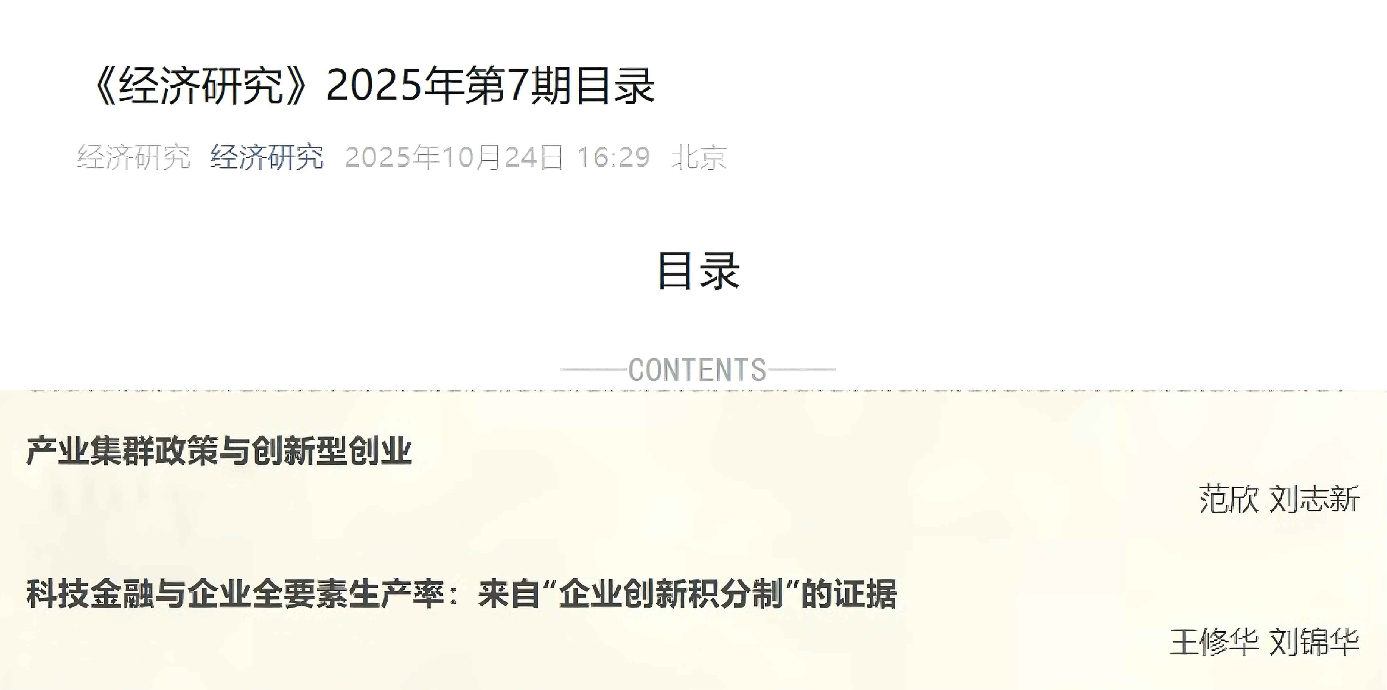 近日,A动漫 应用金融系王修华教授和安徽大学经济学院刘锦华老师(原A动漫 2020级博士研究生)合作的题为“科技金融与企业全要素生产率:来自企业创新积分制的证据”的论文发表在《经济研究》2025年第7期。