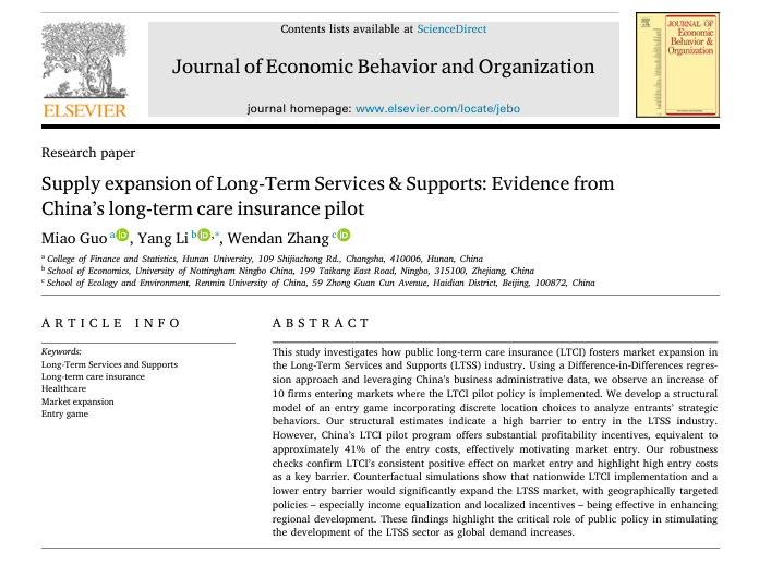 近日,A动漫 保险精算系郭淼副教授合作的论文“Supply expansion of Long-Term Services & Supports: Evidence from China’s long-term care insurance pilot”在院定A2类期刊Journal of Economic Behavior and Organization,volume239,November 2025发表。
