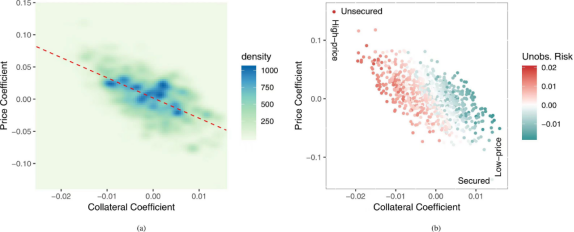 图(a)为借款人价格偏好与抵押品偏好的之间的关系。图(b)为借款人价格与抵押品偏好与还款风险之间的关系。