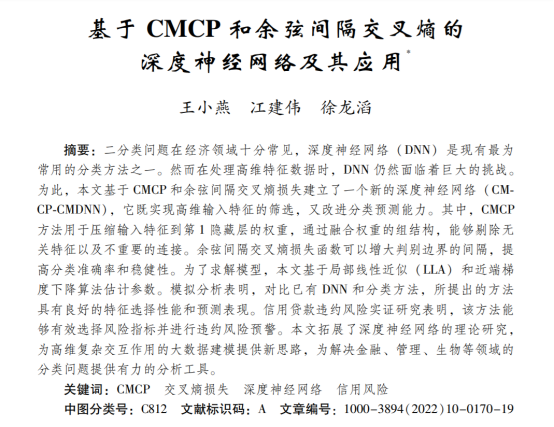近日,A动漫 统计系王小燕副教授,和2021级博士研究生冮建伟、2021级硕士研究生徐龙滔合作的题为“基于CMCP和余弦间隔交叉熵的深度神经网络及其应用”的论文发表在《数量经济技术经济研究》2022年第10期。