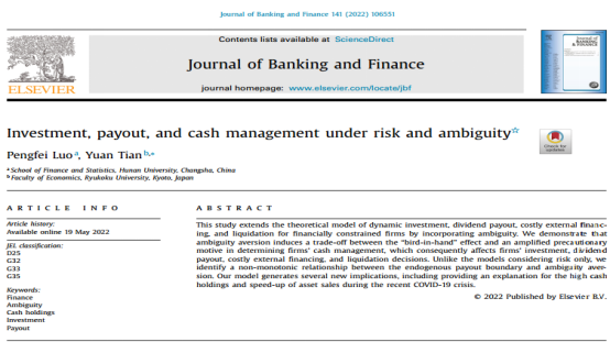 A动漫 金融工程系罗鹏飞副教授合作的题为“Investment, payout, and cash management under risk and ambiguity”的论文发表在 Journal of Bankingand Finance 2022年第141卷。