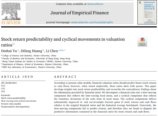 近日,A动漫 金融工程系余得水助理教授的题为“Stock return predictability and cyclical movements in valuation ratios”的论文在院定A类期刊 Journal of Empirical Finance ,volume 72, June 2023发表。
