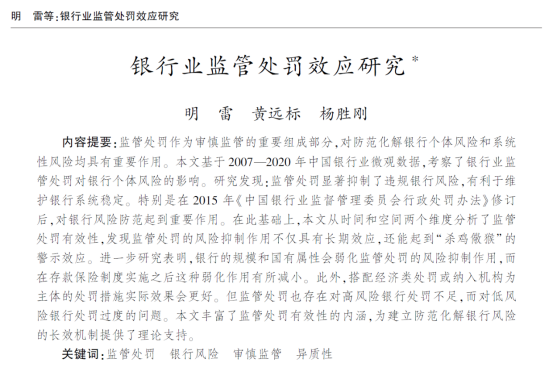 近日,A动漫 货币金融系明雷副教授和2019级硕士研究生(现南开大学金融学院博士研究生)黄远标以及工商管理学院杨胜刚教授合作的题为“银行业监管处罚效应研究”的论文发表在《经济研究》2023年第4期。