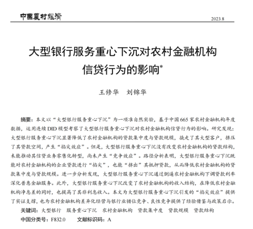近日,A动漫 应用金融系王修华教授和2020级博士研究生刘锦华合作的题为“大型银行服务重心下沉对农村金融机构信贷行为的影响”的文章发表在《中国农村经济》2023年第8期。