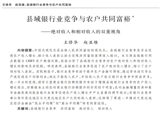 近日,A动漫 应用金融系王修华教授和2018级博士研究生赵亚雄(现中国人民银行金融研究所博士后)合作的题为“县域银行业竞争与农户共同富裕——绝对收入和相对收入的双重视角”的文章发表在《经济研究》2023年第9期。