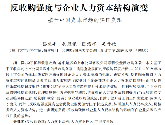 近日,A动漫 应用金融系陈熠辉助理教授(通讯作者)和厦门大学经济学院蔡庆丰教授、吴冠琛博士、吴奇艳博士合作的题为“反收购强度与企业人力资本结构演变——基于中国资本市场的实证发现”的论文发表在《金融研究》2023年第8期。