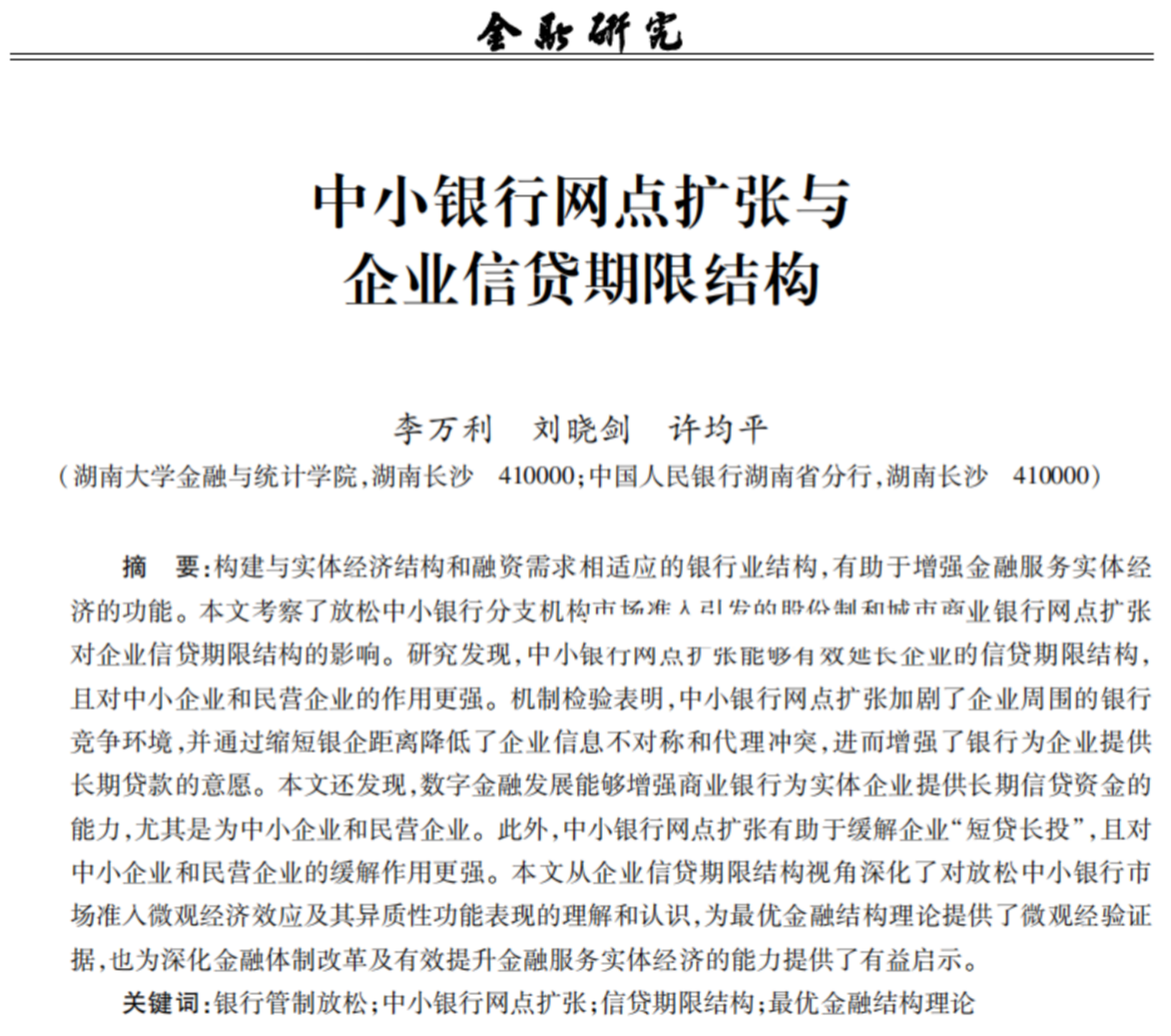 近日,A动漫 应用金融系李万利副教授和货币金融系刘晓剑副教授合作的题为“中小银行网点扩张与企业信贷期限结构”的论文发表在《金融研究》2024年第6期。