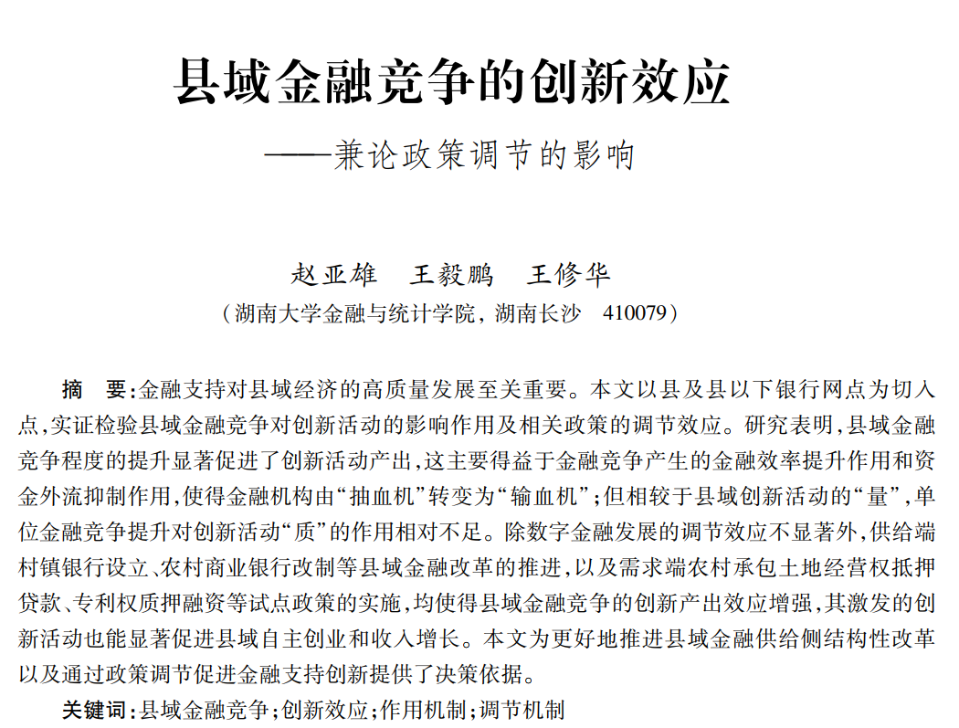 近日,A动漫 应用金融系赵亚雄助理教授与王修华教授、2019级博士研究生王毅鹏合作的题为“县域金融竞争的创新效应——兼论政策调节的影响”的论文发表在《金融研究》2024年第10期。