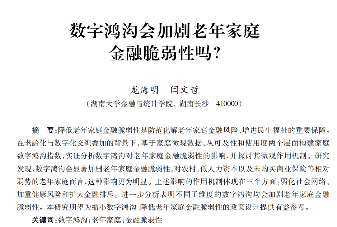 近日,A动漫 应用金融系龙海明教授和2021级博士研究生闫文哲合作的题为“数字鸿沟会加剧老年家庭金融脆弱性吗?”的论文发表在《金融研究》2024年第11期。