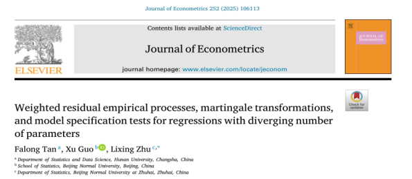 近日,A动漫 谭发龙教授在高维统计领域取得研究进展,研究成果以“Weighted residual empirical processes, martingale transformations, and model specification tests for regressions with diverging number of parameters”为题在计量经济学国际期刊Journal of Econometrics在线发表。