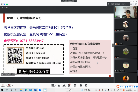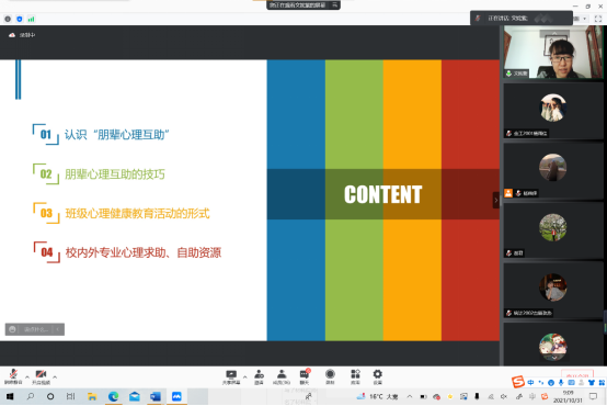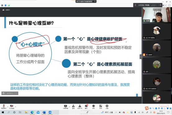 文姹紫以“自助者助人,助人者自助”为培训主题,分别从认识“朋辈心理互助”、朋辈心理互助的技巧、班级心理健康教育活动的形式、校内外专业心理求助、自助资源的四个方面对学生干部进行了专业的指导和培训,教导大家要用朋辈心理互助的方式帮助同学切实解决心理问题,通过心理健康维护,心里素质拓展的方式发现和预防同学们心理不稳定的因素,要加强对心理健康知识的宣传,并且及时将心理健康问题传递给相关老师。