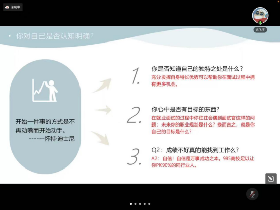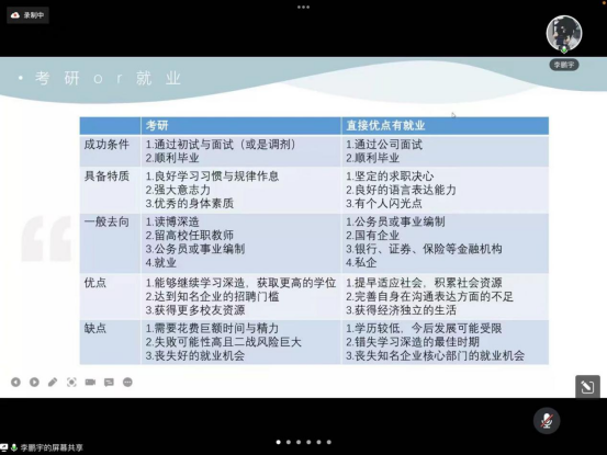 拿到中信证券offer的李鹏宇学长结合自身情况分享了考研和就业的对比区别,他提到考研是一个漫长的过程,等待初试成绩的同时可以进行秋招的了解准备。另外就业侧重于个人和岗位的匹配度,求职的坚定决心和良好的语言表达能力都会对求职有所帮助。