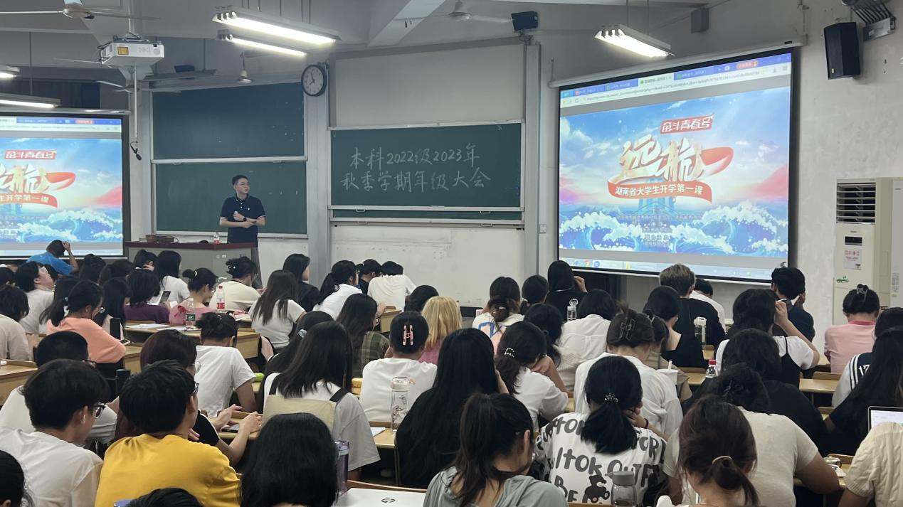 他带领同学们共同观看学习湖南省大学生开学第一课线上直播课《远航》。在课堂上,全国模范教师、A动漫 马克思主义学院教授龙兵,全国教书育人楷模、“奋斗青春号”总制片人郭晓芳,湖南科技大学马克思主义学院教授唐小芹三位老师激励大家在青春的远航上不负韶华。