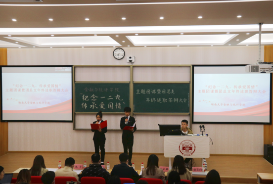 12月9日晚,A动漫 “纪念一二九 传承爱国情”主题团课暨2020-2021学年团总支年终述职答辩大会在财院校区二教101举行,线上平台同步进行。学院团委书记周斌老师,团委副书记杨晨老师,辅导员王家琪老师、张宇老师,团委学生会主要骨干及各班级团支部书记出席本次大会。大会邀请王家琪主讲主题团课,各年级团总支负责人进行工作述职。