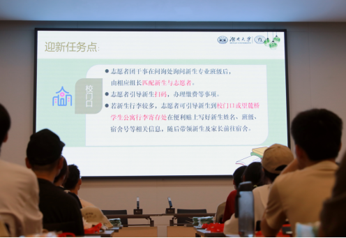 接着,讲述了迎新注意事项,自身安全尤为重要,志愿者须做好迎新准备,在迎新过程中应变各种突发情况。