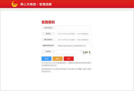 首次登录会提示修改密码。若遗忘密码:在登陆页面点击「忘记密码」,并联系原团支部管理员生成「重置密码验证码」,随后填写下图内容提交,即可重新找回密码。