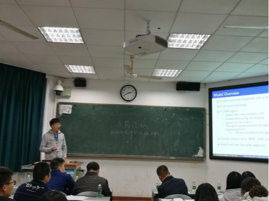 台湾国立中山大学博士.美国代顿大学博士后庄逸伟先生、澳门大学博士董良女士、英国曼彻斯特大学刘薇女士、华南理工大学博士刘桂芳女士、北京师范大学博士周璇女士在金统院分论坛第三分会场(财院校区水教306)分别报告了《Derivatives Trading Behavior in Financial Market》、《高阶风险在中美两国股票市场的定价作用》、《The Role of Macroeconomic Information in High-frequency Realized Volatility and Persistence and Structural Change in U.S Stock Market Volatility》、《A novel jump diffusion model based on SGT distribution and its applications》、《Reinforcement learning model in limit order market》的相关研究。