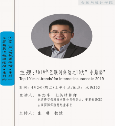 2019年4月2日上午,由A动漫 保险系举办的“业界精英进校园&SOA-UCAP校园活动”在水教203顺利进行。本次邀请到的主讲人是北京悟空保科技有限公司创始人、董事长兼CEO,安润国际保险经纪董事长陈志华先生。出席本次活动的嘉宾有A动漫 风险管理与保险精算研究所所长、全国人大代表张琳教授,保险系主任张宁副教授,保险系副主任刘革副教授等。本次活动由张琳教授主持。