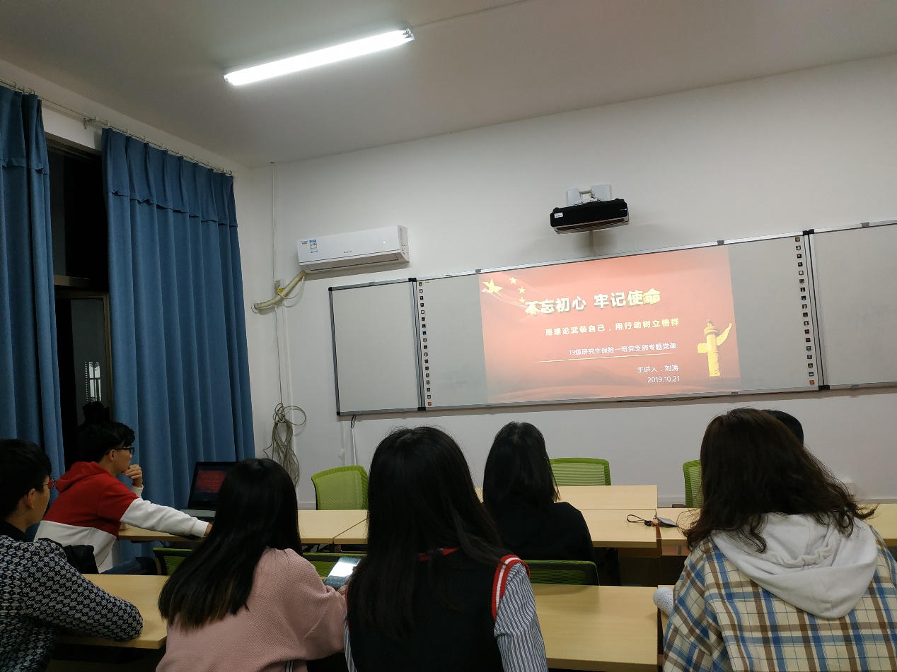 2019年10月21日晚上,A动漫 2019级研究生保险一班党支部在财院校区A动漫 310会议室开展了以“用理论武装自己,用行动树立榜样”为主题的党课活动。本次党课由支部书记刘涛主持,主要分为以下三个部分进行:党章学习,党支部工作条例学习,近期学习心得分享。