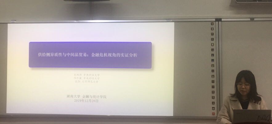 中央财经大学的邱亦霖博士就论文《供给侧异质性与中间品贸易:金融危机视角的实证分析》进行汇报,由A动漫 罗鹏飞助理教授进行评论。邱亦霖博士等以金融危机为切入点考察了中间产品进口对纯内销企业总产出的差异性影响,实证结果表明金融危机发生后,由于供给冲击的影响,中间品进口对纯内销企业总产出的正向作用明显减弱,结合上下游产业链分析样本期间纯内销企业上游行业产能削弱了中间品进口对于企业总产出的正向边际作用,同时增强了对企业总产出的正向作用,这在一定程度上缓解了中间品供给所带来冲击的影响。