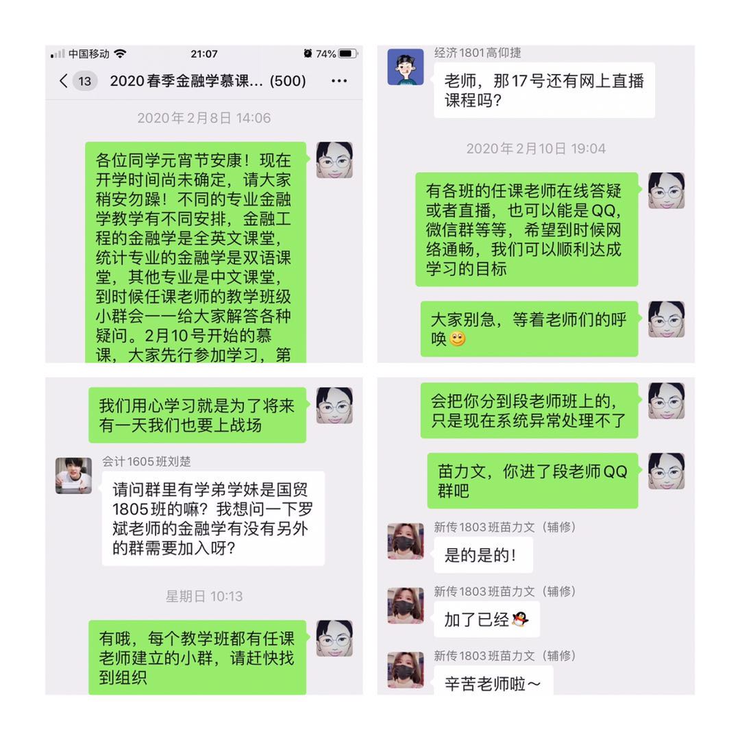 开学后,针对个别学生遇到的困难和问题,金融学团队的全体老师,付出了极大的耐心和关爱。龙薇老师的西藏学生,管理1803班的白马卓嘎,住在美丽遥远的西藏村庄,网络和信号都难以支撑听课需要,因为担心赶不上教学进度,十分焦急。龙老师安慰她,让她尽力学习,并且承诺疫情结束后为她单独补课,不会让她掉队。黄颢老师的一位来自也门的留学生,不知道如何注册金融学SPOC,黄老师一步步指导他直至深夜,终于注册成功。王忠生老师班上有两位来自安哥拉的留学生莫哥和马丁兄弟,已是第二次参与课程学习,王老师通过单独与他们认真细致的沟通交流,得知他们人在长沙,正在努力学习课程和中文语言,才放下心来。对于班上四位新疆、西藏的少数民族同学,王老师也是逐个与他们联系沟通,了解学习情况,随时解决他们遇到的问题和困惑。对同学们学习中遇到的各种困难,罗斌、许朝晖、李晋娴老师都耐心与他们沟通,确保每一位同学能找到合适的学习方式,不耽误学习。课程助教李震林博士耗费巨大的精力,手动将710个学生线上分组,保证教学的正常开展。