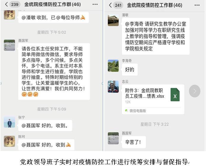 疫情突发后,学院6名辅导员闻令而动,主动作为,化身信息员、宣传员、咨询员、协调员、指导员等多重身份,用实际行动守护时代之光,筑牢安全底线,守护金统学子的生命安全,为金统学子照亮未来之路。她们认真摸排,坚守“战疫”防控的云端第一线,坚持“系统打卡”及“每日一报”双线监督结合,成立党员“一对多”以及留校学生“多对一”小组,搭建信息网,层层上报,“点对点”精准掌握所有学生的身体健康状况。对于目前正在湖北及其他重点防控地区的学生和其他需要重点关心、关注的学生建立“一人一档”,时刻保持沟通,确保学生生命安全。