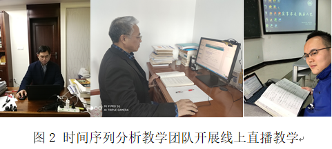 在课程的筹备阶段,教学团队率先学习使用了诸如雨课堂、超星、腾讯会议、腾讯课堂等线上教学平台,积极地进行线上教学资源的搜集、试验和筹备。他们提前与学生进行了充分的沟通,并选择了合适的教学直播平台。在原定开学时间提前半个月左右前,团队建立好了与学生沟通的微信、QQ群,并统一组织将课程资料、慕课等资源提前分享给了学生。在原定的开学时间2月17日,时间序列分析教学团队率先开展课程直播,做到了“停课不停教”。