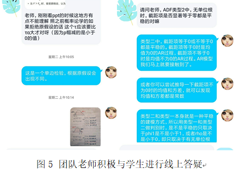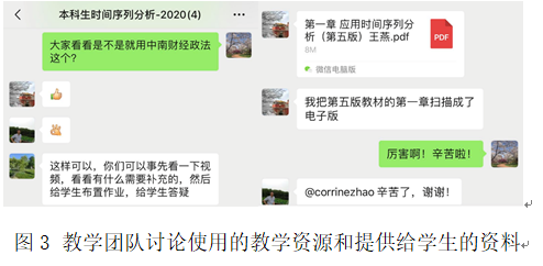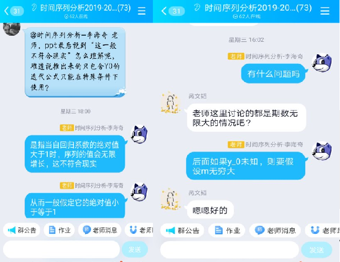 此外,为了让学生尽快适应和熟悉线上教学平台,时间序列分析课程团队老师积极与学生进行沟通,指导学生安装线上教学软件,了解学生的困难与需求,做到“让每一位学生都能参加课程,不让任何一位学生掉队”。