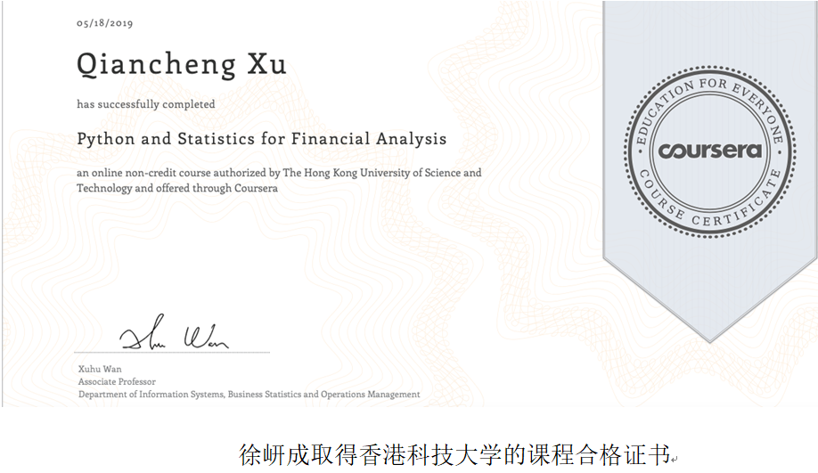 在大三下学期中,当意识到自己相比统计专业、金融工程专业的同学在计算机、数理能力上存在的不足后,他参加了名校网课学习,完成了Python以及微分方程方面的6门网课学习并获得合格证书。