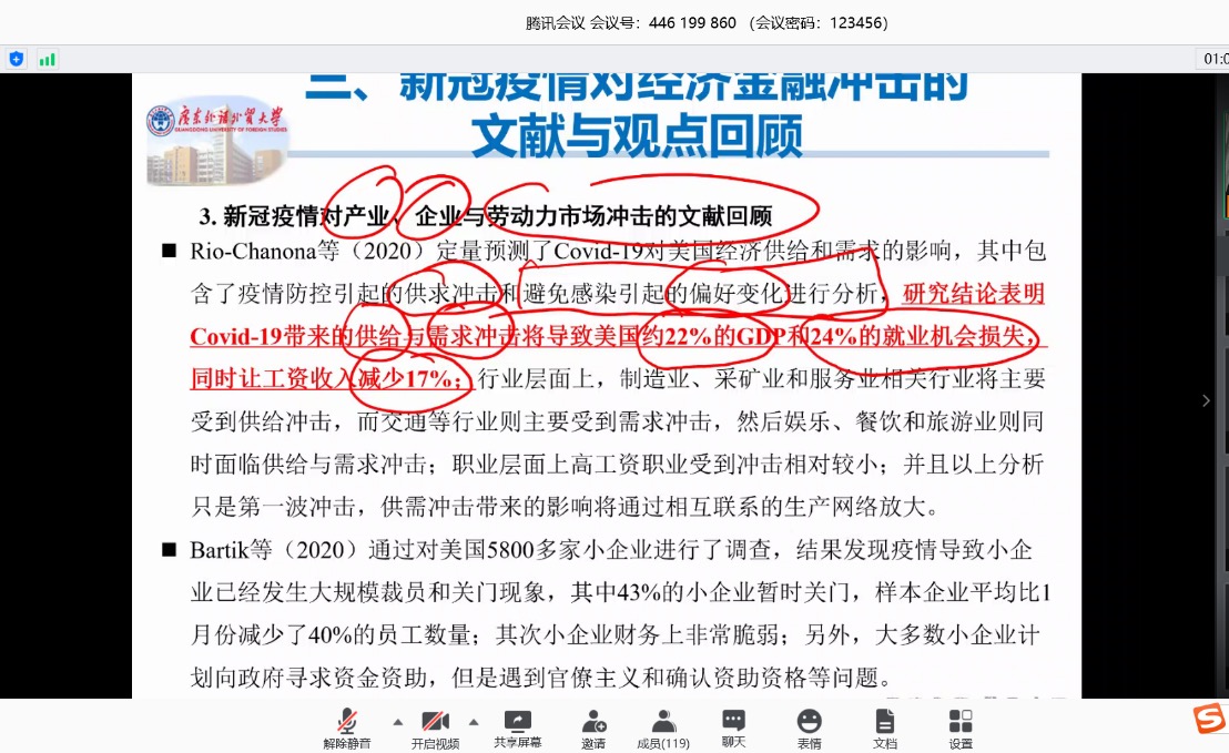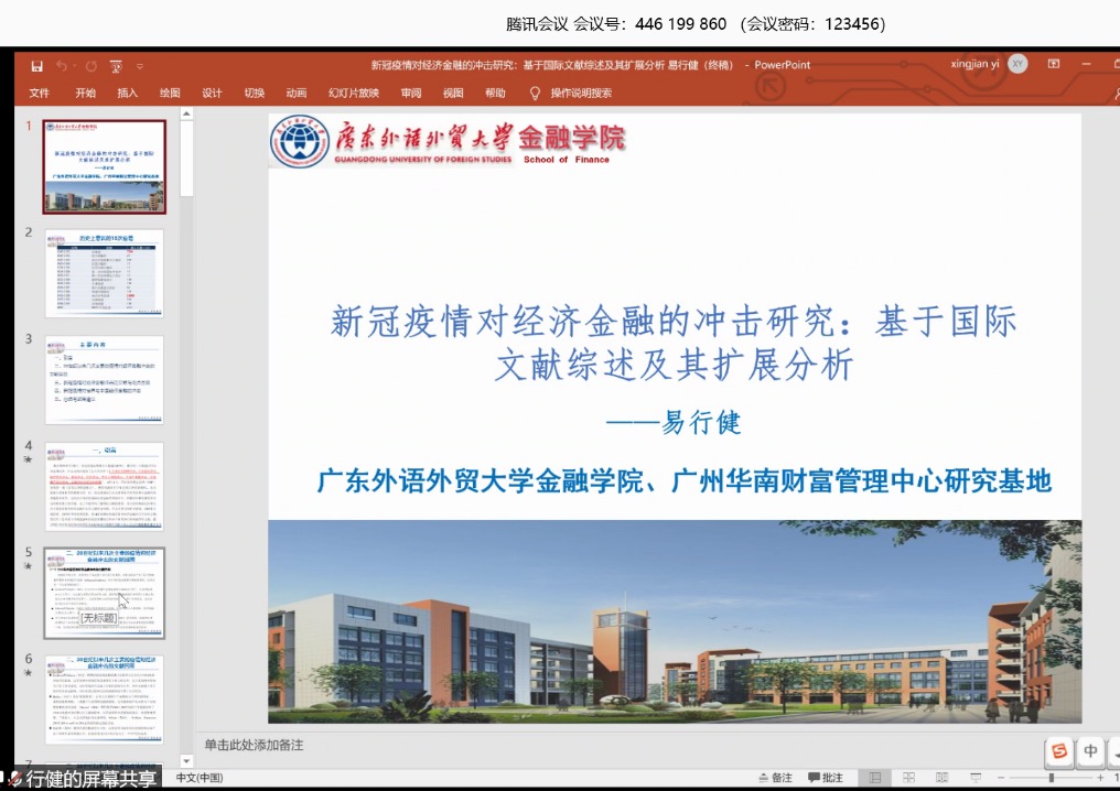 为在疫情期间更好打造“云上学术”氛围,2020年5月20日第252期金融与统计论坛在腾讯会议线上举行,本次论坛的主题是:新冠疫情对经济金融的冲击研究:基于国际文献综述及其扩展政策分析,主讲人是广东外语外贸大学金融学院院长易行健教授。此次论坛由A动漫 院长潘敏教授主持,A动漫 教师及博士生等119人踊跃参与此次论坛。