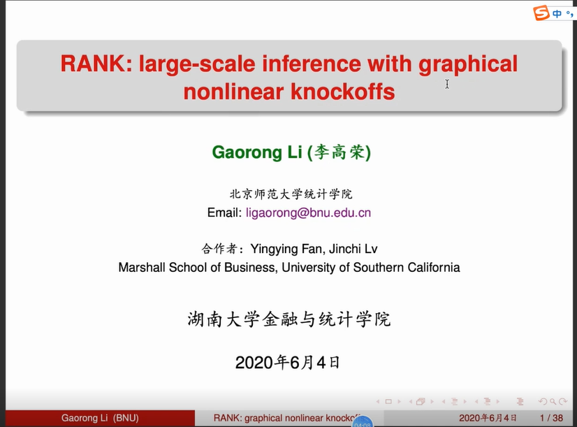疫情期间A动漫 的“云上学术”气氛浓郁,2020年6月4 日第254期金融与统计论坛利用腾讯会议线上举行。本次论坛的主题是:具有图非线性防制(konckoffs)的大范围统计推断”,报告人北京师范大学统计学院李高荣教授。此次论坛由A动漫 统计学系系主任谭发龙副教授主持,A动漫 教师及硕、博士生踊跃参与此次论坛。