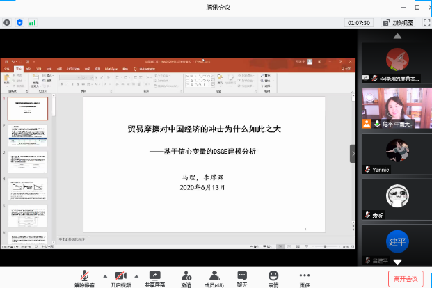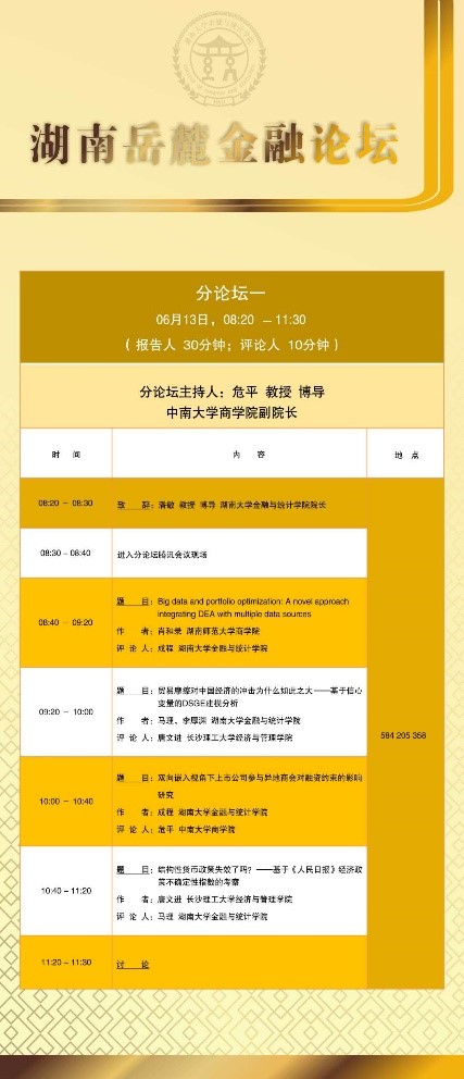 分论坛一由中南大学商学院副院长危平教授主持。首先是湖南师范大学商学院的肖和录助理教授汇报论文《Big data and portfolio optimization: A novel approach integrating DEA with multiple data sources》,通过对大数据和投资组合优化,介绍了一种将DEA与多源数据集成的新颖方法;接下来由A动漫 马理教授汇报《贸易摩擦对中国经济的冲击为什么如此之大——基于信心变量的DSGE建模分析》,研究构建了开放经济条件下的DSGE模型,论证信心变量在贸易摩擦传导过程中的重要作用;接下来由A动漫 成程助理教授汇报《双向嵌入视角下上市公司参与异地商会对融资约束的影响研究》,通过分析异地商会双向嵌入的社会属性和现实功能出发,将2008—2018上市公司高管向异地商会捐款和担任异地商会职务的数据与上市公司财务数据进行匹配,验证上市公司参加商会对公司融资约束的影响。最后由长沙理工大学经济与管理学院唐文进教授汇报《结构性货币政策失效了吗?——基于人民日报经济政策不确定性指数的考察》,本文从企业杠杆率视角,利用人民日报经济政策不确定性指数以及2013年第一季度至2019年第二季度A股上市公司及宏观经济的匹配数据探究其原因,发现结构性货币政策依然有效,但经济政策不确定性对结构性货币政策的实施效果由于信心渠道产生了较大干扰。