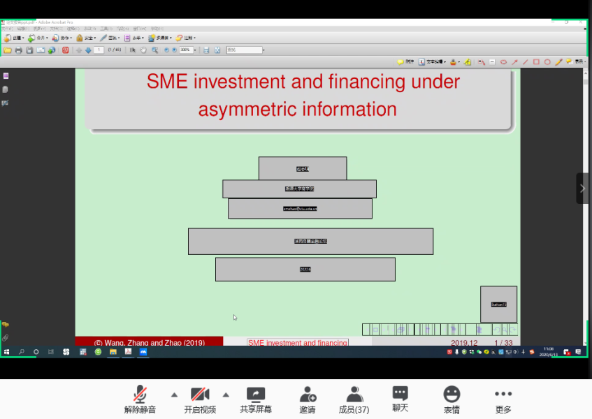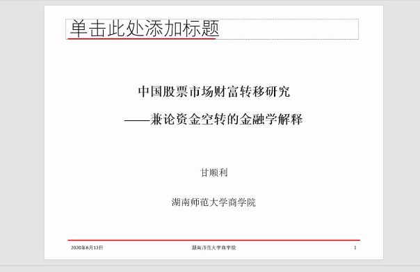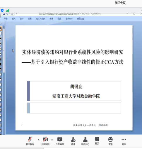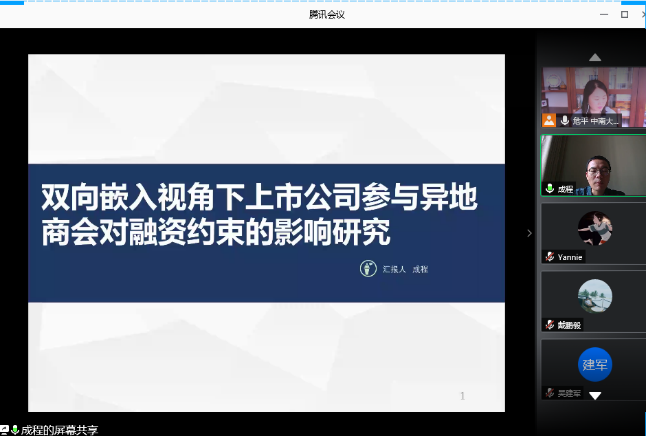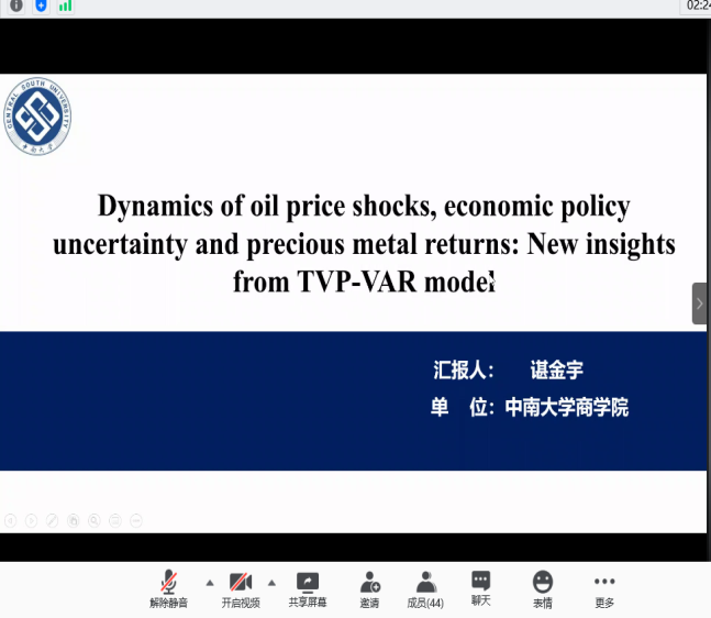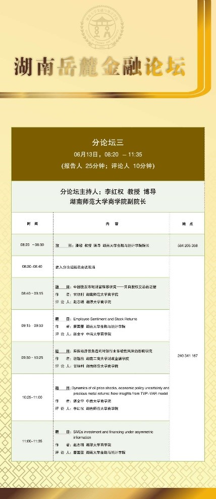 分论坛三由湖南师范大学商学院副院长李红权教授主持,首先由湖南师范大学商学院甘顺利助理教授汇报《中国股票市场财富转移研究——来自股权交易的证据》,本文以2007年第1季度至2019年第4季度中国上市公司股权交易为研究对象,估算了资金空转的收益,并考察了资金空转收益的决定因素;接下来由A动漫 唐国豪助理教授汇报《Employee Sentiment and Stock Returns》,文章提出了员工情绪指数,作为投资者情绪与经理人情绪的补充,并在样本内和样本外发现了高员工情绪指数能够负向预测未来股票收益;接着湖南工商大学财政金融学院胡锡亮助理教授汇报《实体经济债务违约对银行业系统性风险的影响研究》,本文基于Merton(1974)的标准CCA方法,分析了实体经济债务违约对银行业系统性风险的非线性激增机制,明晰了Nagel & Purnanandam(2020)修正CCA方法嵌入的银行股权与负债“期权的期权”与银行资产收益非线性特征;接下来由中南大学商学院谌金宇副教授汇报《Dynamics of oil price shocks, economic policy uncertainty and precious metal returns: New insights from TVP-VAR model》,基于时变参数矢量自回归(TVP-VAR)模型,研究使用1990年4月至2018年4月的月度数据,着重分析了油价冲击和经济政策不确定性对贵金属收益的动态影响;最后由湘潭大学商学院赵志明助理教授汇报《SMEs investment and financing under asymmetric information》,研究在信息不对称的动态环境中受财务约束的中小企业的投资时机和融资决策。