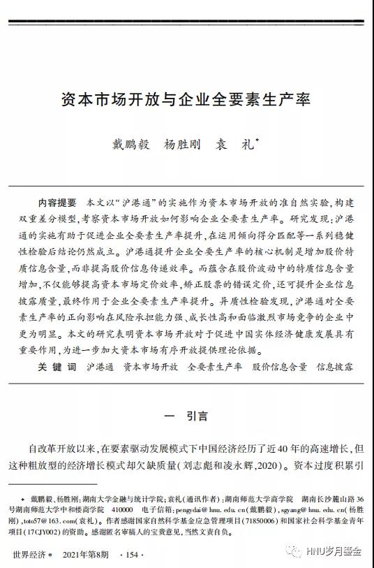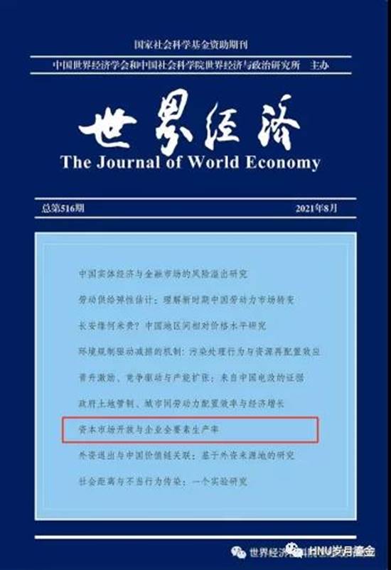 近日,由A动漫 2019级博士生戴鹏毅与杨胜刚教授作为共同第一作者、湖南师范大学袁礼副教授作为通讯作者合作完成的论文《资本市场开放与企业全要素生产率》发表在《世界经济》2021年第8期,该期刊是校定A2期刊。