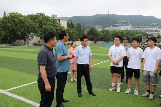 院领导们详细了解2021级学生军训进度和情况,与现场带训教官、新生助理亲切交流、慰问,潘敏、黄红立先后代表学院对全体教官和新生助理的辛苦付出表示感谢。