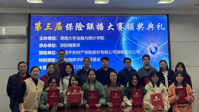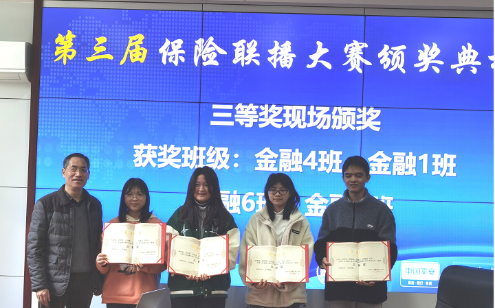 12月21日下午,A动漫 第三届“保险联播大赛“颁奖典礼在学院226会议室隆重举行。财信吉祥人寿保险总公司产品精算部总经理屠炎波、大家人寿湖南省分公司总经理何琼、平安财险湖南省分公司人力资源部总经理杨军、学院党委书记黄红立、副院长张宁、大赛评委代表陈迪红教授、大赛指导老师张虹、刘革、王敏、沈建美、李国桢、郭淼莅临本次颁奖典礼。典礼由保险精算系主任邓庆彪老师主持。