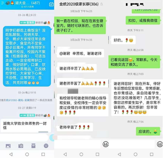 谢君接到疫情消息后,第一时间摸排学生信息,全盘摸清“自己的学生到底在哪里,是否安全”。她通过下寝室、打电话、聊微信等方式,关心着自己的“孩子们”,并为他们进行心理疏导等,确保孩子们每天“吃得好、睡得好、学得好”。为了不让家长们担心,她还每天在家长群里发布学校最新的“抗疫动态”,并向家长们承诺:“我一直在,你们不用紧张,孩子们我会尽全力替大家照顾。”有了这句承诺,家长们对学校充满了信心,“我们家长们不要恐慌,老师会照顾好我们的孩子的”“都不要担心,学校肯定会尽快解决的”……