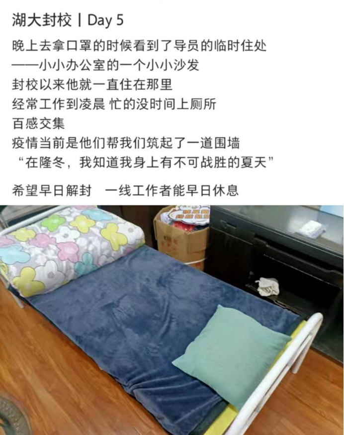 杨晨在这场“疫情遭遇战”里多了一个“亲密战友”——放在办公室里的行军床。疫情发生后,他住进了办公室,不管有任何紧急任务,他总是第一个到。白天,他在志愿者、就诊陪护员、核酸检测点协调员、楼栋负责人、物资配送员、事物调解员等各种角色中不断切换,夜晚,他回到办公室,开始一对一联系学生,关心学生的近况,为学生修改简历、传授面试经验等等。疫情打乱了很多计划,但是他深知毕业班学生升学和就业的进度不应该中止。他说:“每天都挺累的,但是也要坚持,而且,我还有我的‘战友’陪着我呢。”