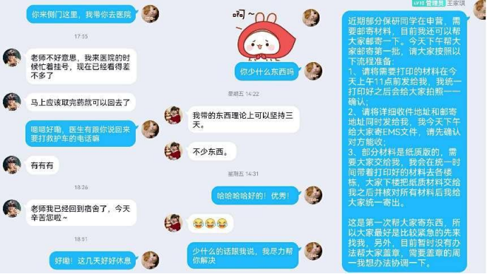 去年刚留校的王家琪接到“就地静止”通知后,“立刻行动”,赶到楼栋和值班员一同维持秩序,劝返有意向外出的同学。除了要摸清自己带的四百余名学生的去向,安抚学生情绪外,她还要负责学生公寓A栋的“包干”工作。A栋一共有三百多间寝室,为了做到“精准摸排”,她一间一间寝室走访,并叮嘱大家务必完成每日的“全员核酸”。她说:“弟弟妹妹们的事情,一件都不能耽搁。”学生生病了,她第一时间陪同前往校医院看病,时刻关注学生的状态;大三的学生申请保研夏令营需要很多材料,她亲力亲为,为学生开具证明、打印成绩单、寄送快递……她和学生们说得最多的一句话就是:“有任何问题,随时与我联系。”