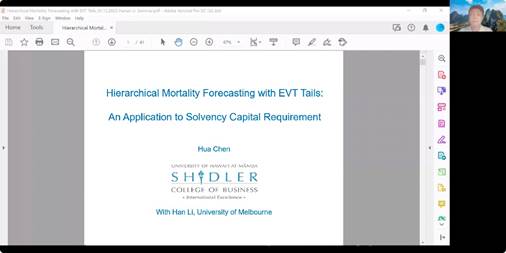 5月12日上午,由A动漫 主办的第343期金融与统计论坛在线上腾讯会议顺利举办。本次讲座由A动漫 副院长张宁教授主持,邀请来自美国夏威夷大学马诺阿分校的陈铧教授做题为《死亡率预测与准备金充足率研究》的学术讲座。保险精算系毕达宁老师、何玲瑀老师等50余名师生积极参加了此次讲座。