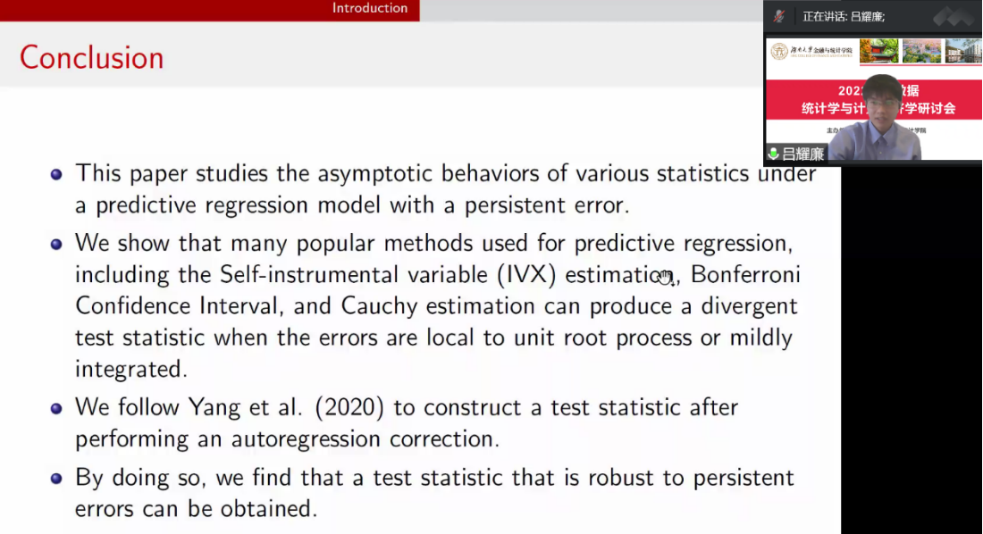 吕耀廉助理教授报告的题目是“Robust Inference for Predictive Regression under Persistent Errors。吕耀廉助理教授首先指出,当预测回归模型中随机扰动项含有高持续性时,现有的显著性检验统计量会产生严重的尺寸扭曲问题。他们发现当随机扰动项服从近单位根特征过程或中等偏离过程时,Bonferroni置信区间法、基于柯西估计量的检验统计量和基于自辅助工具变量法的Wald检验统计量无法提供有效的渐近推断。为了解决高持续性随机扰动产生的过度拒绝问题,他们提出了基于序列自相关Cochrane-Orcutt修正的稳健推断方法。由此产生的检验统计量具有渐近卡方分布,并且在近单位根和中等偏离的随机扰动情形下,均具有优良的统计性质。最后,他指出稳健性检验方法可运用于对房价的实证研究。