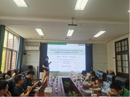 研讨会上,主讲人郭淼老师做了主题为《Long-term Care Insurance and Household Living Expenditures: Evidence from China》的学术报告,就当下中国长期护理保险对家庭生活开支的影响进行了分享。2016年,长期护理保险(LTCI)在中国15个城市展开试点,主要基于失能程度、医疗保险购买类型等因素判断居民是否具有购买长期护理保险的资质。相较于国内外学者探究保险在个人层面的影响,该论文聚焦于其在社会福利方面的推进,以150个国家45岁年龄及以上的居民为调查对象,2年为时间周期,搜集得到近15000个家庭的追踪调查数据。郭老师首先引用拟线性效用函数,发现对于降价商品,收入效应大于替代效应;接着将数据划分为实验组和对照组,采用双重差分模型具体探讨了购买长期护理保险后,衣食住行和医疗支出方面经费的变动。通过相关模型检验验证结论的显著性。在会议上,参会老师针对问题背景,数据来源以及模型构建等方面提出了自己的见解并展开了讨论。郭淼老师与参会的老师们就长期护理保险的社会背景、高级宏观经济学原理、模型参数的实证结果的相关解释等方面的问题进行了深层次探讨。