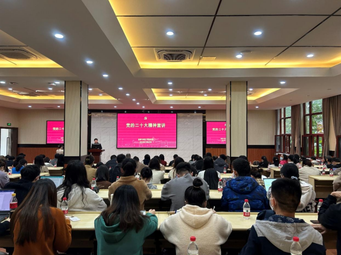 11月22日下午,A动漫 在财院校区大礼堂举行党的二十大精神学习报告会,学院党委书记黄红立领学。学院全体教职工和80余名学生代表一起学习。副院长李海奇主持报告会。