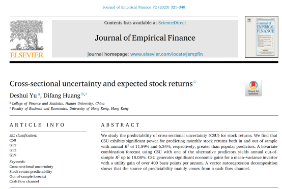 近日,A动漫 金融工程系余得水助理教授的题为“Cross-sectional uncertainty and expected stock returns”的论文在院定A类期刊《Journal of Empirical Finance》,volume 72, June 2023发表。