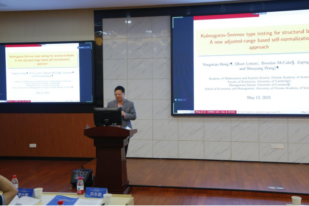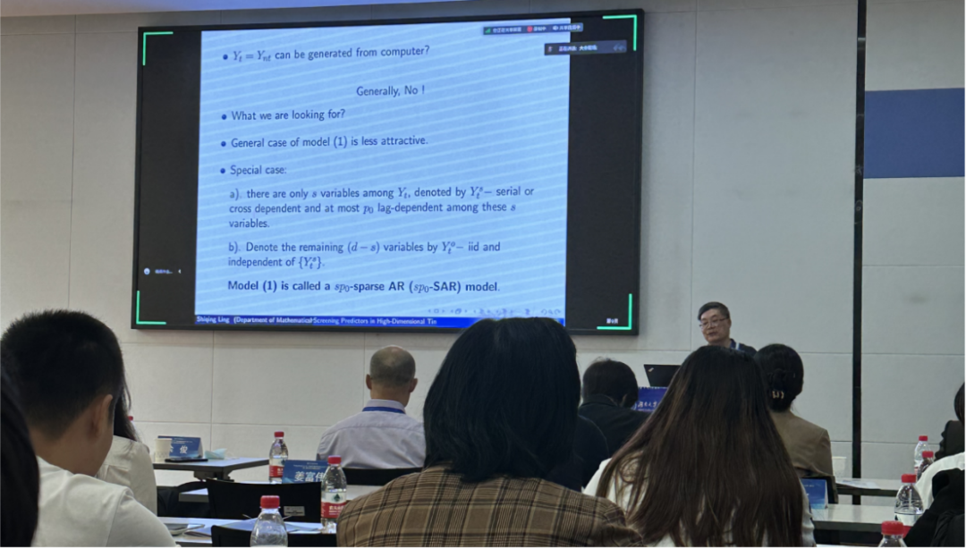 第二时段特邀报告由中国科学院数学与系统科学研究院孙玉莹副研究员主持,香港科技大学数学系凌仕卿教授和新加坡管理大学经济学院余俊教授做主旨演讲。凌仕卿教授以《高维时间序列预测因子筛选方法》为题进行分享。凌仕卿教授首先介绍了稀疏高维向量自回归模型,提出了一种基于自适应套索的预测因子筛选方法以及其渐近性质。凌仕卿教授随后介绍了高维因子向量自回归模型,提出了对应的因子筛选方法,研究了其理论性质和实际应用。余俊教授以《长记忆的弱识别对波动率建模的影响》为题分享了他的最新研究成果。余俊教授首先介绍了波动率的长记忆性及其建模,之后讲解了长记忆波动率模型的弱识别问题。为了解决这个弱识别问题,余俊教授提出了一种识别稳健的置信集合构建方式。最后,他详细阐述了该方法在已实现波动率中的应用,发现对于已实现波动率的估计常出现弱识别的问题,解释了为何实证文章中会广泛出现两种不同的结果。
