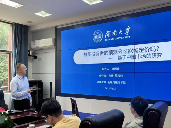 研讨会上,主讲人唐国豪老师以《机器投资者的预测分歧能被定价吗?——基于中国市场的研究》为主题进行学术报告。投资者分歧是金融市场的基本特征,本次报告结合近年来兴起的机器学习方法,通过神经网络模型模拟不同投资者之间的信念差异,构建投资者预测分析度的统计测度,探究机器投资者预测的股票分歧度水平在中国股票市场是否能够被定价。通过输入105个公司特征因子指标、更新权重矩阵、应用正则化技术等构建神经模型,结果表明在中国股票市场,股票的分歧度水平越低,投资者的预测越一致,股票的预期收益越高,改变投资者数量、神经元数量、惩罚条件等因素,反向关系均为稳健的。进一步分析发现,会计信息质量和专家关注度均可能影响分歧-收益的反向关系强度,同时通过分析分析师盈余预测分散度,发现机器投资者的分歧度对分析师的分歧具有一定的先导作用。