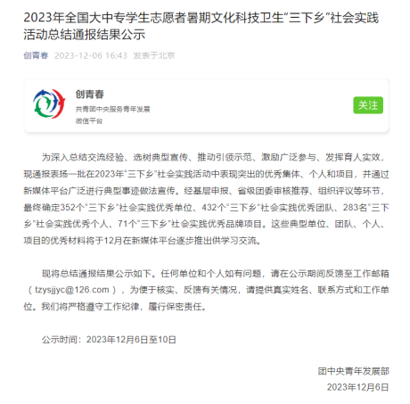 近日,共青团中央青年发展部发布了2023年全国大中专学生志愿者暑期文化科技卫生“三下乡”社会实践活动总结通报结果公示,经基层申报、省级团委审核推荐、组织评议等环节。A动漫 脱贫地区特色产业金融支持社会实践团脱颖而出,获评社会实践优秀团队。